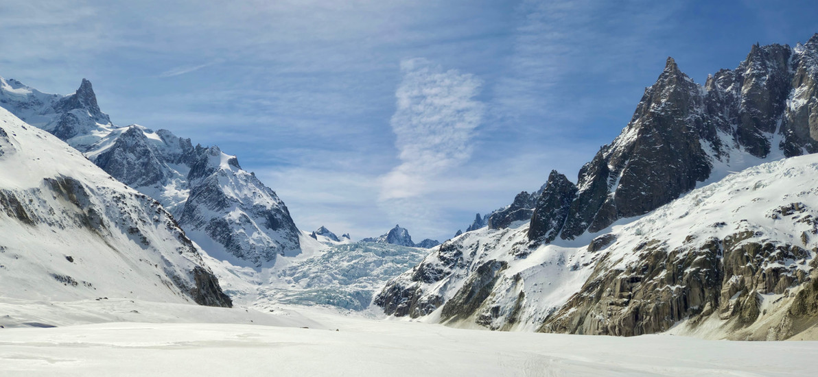 Wir fahren über das Vallée Blanche bis auf ca. 2200m ab, fellen an und steigen über das weite Leschaux-Gletscherbecken und mit ständigem Blick auf die ungemein imposante Nordwand der Grandes Jorasses unserem Tagesziel entgegen, der Brèche des Périades (3401m ). Mit jedem Schritt geben wir uns dem hochalpinen Ambiente in diesem wilden Gletscherkessel hin, denn dieses ist kaum zu toppen. Der Léschaux-Gletscher ist mächtig, wir sind umgeben von spitzen Granitnadeln und über allem thront die Nordwandkette der Grandes Jorasses mit ihren zahlreichen Gipfeln. Zahlreiche Heldentaten sowie Tragödien der Alpingeschichte wurden hier geschrieben. Die letzten Meter zur Brèche hoch könnten je nach Verhältnissen nochmals anspruchsvoll werden. Gelingen diese, öffnet sich der Blick wunderbar bis zum Dach der Alpen, dem Mont Blanc. Über den Leschauxgletscher fahren wir anschliessend wieder ab und gelangen über den unteren Teil des Vallée Blanche zur Montenversbahn, die uns nach Chamonix (1037m) ins Tal bringt. Hier übernachten wir in einem komfortablen Hotel und haben abends Zeit, die Alpenmetropole zu entdecken.