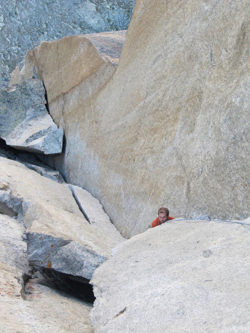 L5 7a Schlüssellänge. Bis zum Überhang Cam #1 und kleinere, anschliessend das ganze Gear. Der Überhang sieht schwierig aus, geht nach rechts weg jedoch gut auf. Danach Squeeze-Chimney und die eigentliche Crux, auf Piaz wechseln und den Kamin verlassen. Diese Stelle ist mit einem Bohrhaken gesichert. Hängestand. Tip: Helm abnehmen und das Gear an Schlinge um die Schulter statt an den Gurt.