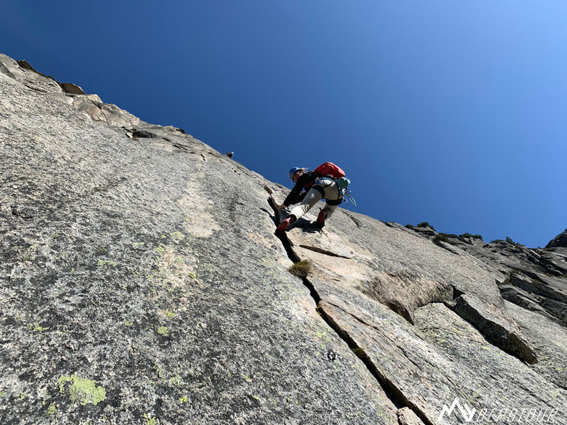L4 6b+ Schwerste Stelle gleich am Anfang. Danach ein wunderschöner, athletischer Riss in traumhaftem Fels. Viele werden diesen wohl piazen, obwohl er mit Klemmtechnik deutlich einfacher und schöner zu klettern ist.